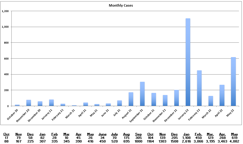 Jefferson County saw 619 cases in May 2022, more than twice as many as April, and nearly five times as many cases as March. The total cases in May 2022 is second only to the peak of 1,108 in January 2022. As the New York Times reported on May 31, the omicron surge has sharply increased the COVID-19 death rate for people 65 and over, and that’s a large portion of the people in Jefferson County. For the most current case rate, go the County Health Department’s online risk calculator. About half of all new cases recorded in Jefferson County are from people who took a home test and reported it to the health department. You can report a test result at the link above.