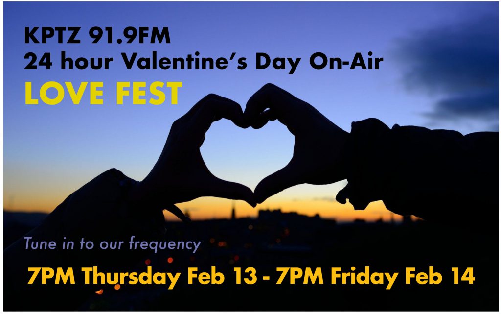 It’s on! KPTZ’s LOVE FEST starts tonight. It’s a 24-hour radio party and everyone is invited. Beginning Thursday, February 13 at 7pm with Pete Lack’s Disco Geezer show, and running through Friday, February 14 at 7pm. Tune into KPTZ 91.9FM for live music, interviews, DJ sets and literary readings, here’s a sneak peak!