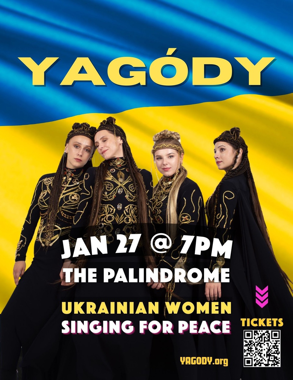 | KPTZ is so excited to join the Palindrome in welcoming back Yagody to the Palindrome in Port Townsend on Tuesday, January 27 at 7pm. Yagody is a Ukrainian musical project created in the aftermath of Russia’s 2014 invasion of Ukraine. Yagody is on a mission to preserve, reinterpret, and breathe new life into ancient Ukrainian folk songs and traditions. They are celebrated for their primal energy and hypnotic vocal harmonies. This quartet have dynamic and contemporary performances which highlight ethno-ritual as well as feminine resilience. **maybe an interview on kptz??** Brought to you by KPTZ and the Palindrome. |