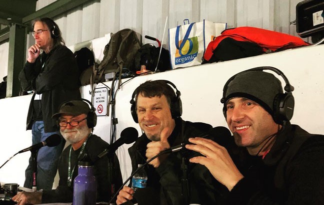 The KPTZ Remote Crew Keep It Easy from above Memorial Field’s 50-yard line at Friday night’s awesome face off between the Port Townsend High Redhawks and the Chimacum Cowboys. (l-r: Remote lead Mike Carroll, DJ hosts Peter Robinson and Kurt Munnich, and co-announcer Matt Orr)